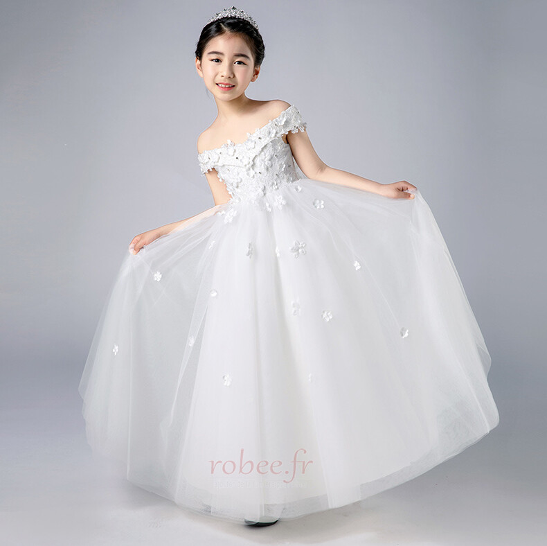 Accueil Robes de fille de fleur Robes de fille de fleur Tulle Robe de fille de fleur Rosée épaule Fleurs Médium Mancheron A-ligne