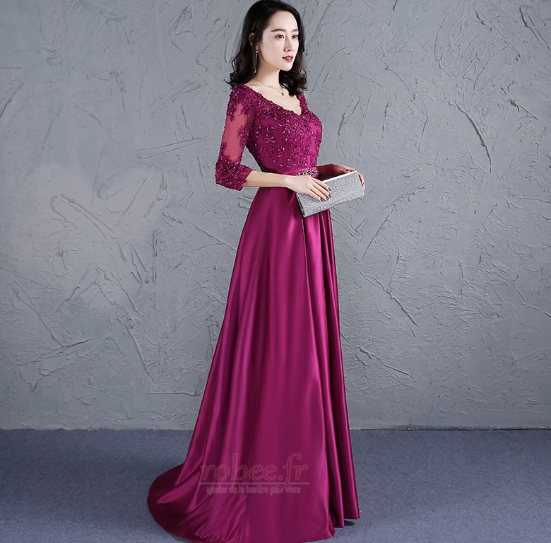 Robe de soirée Soie Perle Traîne Courte Couvert de Dentelle 3/4 Manche #E2203938